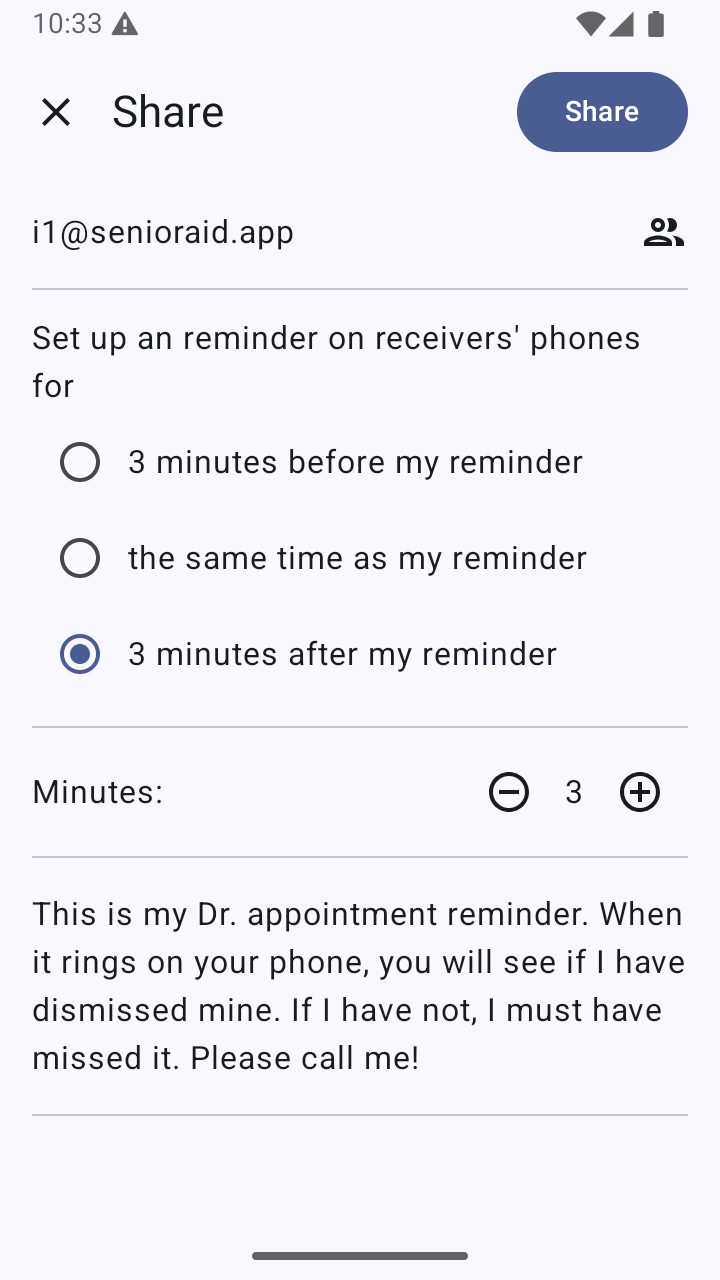 Want to make sure someone you care for does not miss a reminder? Create it and share it with them. Make their reminder ring a few minutes earlier. If they miss it, you will know.